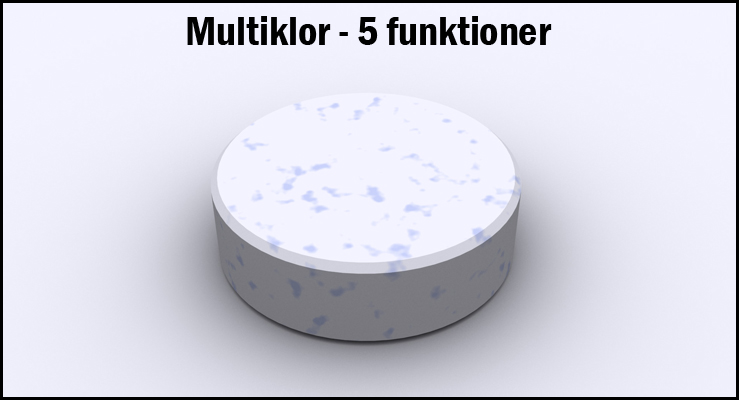 Fem funktioner i en tablett! Denna 200 grams multiklortablett löses upp långsamt och klorerar, flockar, algdräper, pH stabiliserar och mjukgör vattnet i din pool. Placeras i skimmern eller i en "floater". Tänk på att pH värdet måste vara rätt för att kloreringen ska fungera optimalt. Läs mer om detta under vattenfakta.