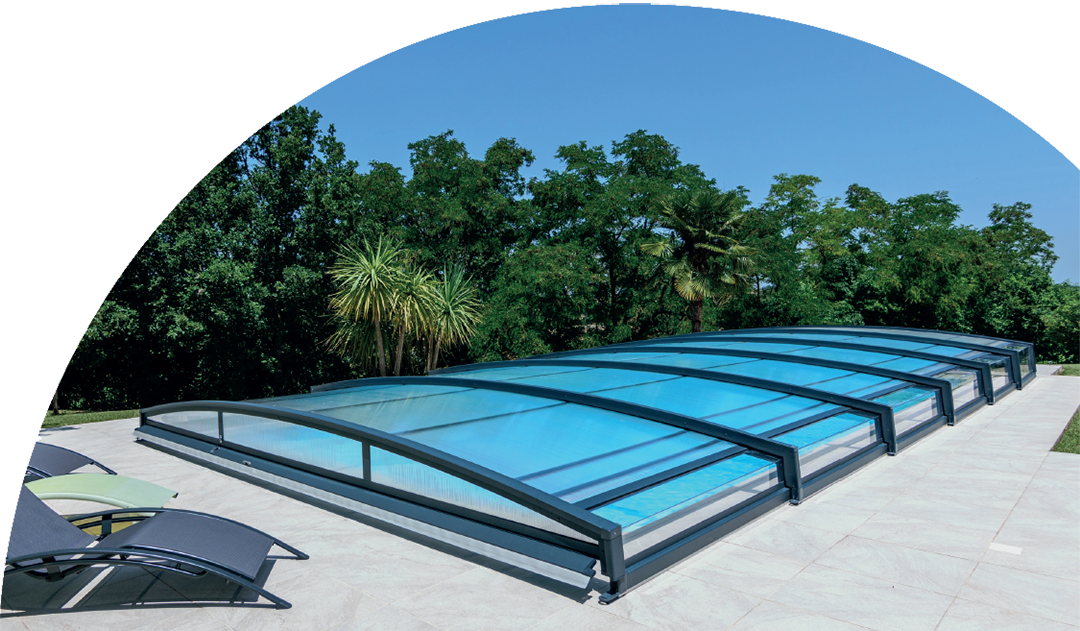 Taken har riktigt låg profil och de löper i en snillrik list på ena sidan av poolen vilket gör installationen långt mycket enklare och snyggare. Dessutom är det inget som helst problem att montera våra tak själv, om man är lite lätt händig, de kommer nämligen färdigmonterade. Men man får ha handräckningshjälp såklart, annars blir det svårt att hantera så stora konstruktioner! :)