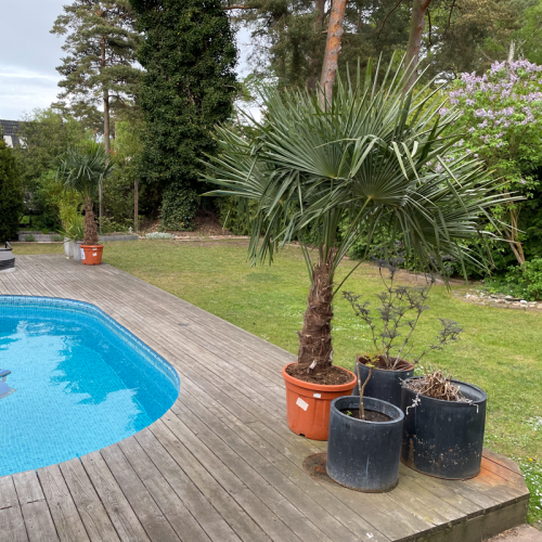 Frågan var om man kunde få till riktiga palmer i sitt poolområde! Vi har sett palmer permanent planterade i södra rEngland (!) och växandes i bergen i Japan. Frågan man alltid ställt sig är, vad är det för palmer och tåler de Skandinavisk klimat? Poolklubben befinner ju sig så långt söderut man kan komma i vårt avlånga land (nästan) så det borde ju vara möjligt.