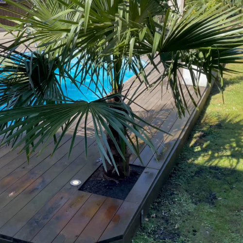 När vi hade bestämt oss för var de skulle stå så sågade vi med hjälp av en cirkelsåg bort 4 st trallbrädor mellan bärlinebalkarna som ju oftast ligger med cc 600mm (bara leta upp skruvarna och såga 25 mm från dem). Därefter grävde vi två djupa gropar som vi därefter fyllde till hälften med väldränerad planteringsjord "medelhavs jord" och sen planterade vi palmerna och fyllde hela facket som vi sågat upp med "medelhavsjord". Nu är ju redan "jorden" mycket väldränerad runt detta poolområdet då hela Höllviken är byggt på en sandrevel :) Men vi tänkte vi följer instruktionen, som medföljde palmerna, till punkt och pricka. När vi var klara skruvade vi fast den yttersta trallbrädan som vi sågat bort.