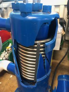 - Du och din kompis lyfter nu ut den från där den står och tippar den bakåt mot unionerna i ca 45° vinkel och tömmer ut de sista decilitrarna vatten som står i botten på värmeväxlarenheten.