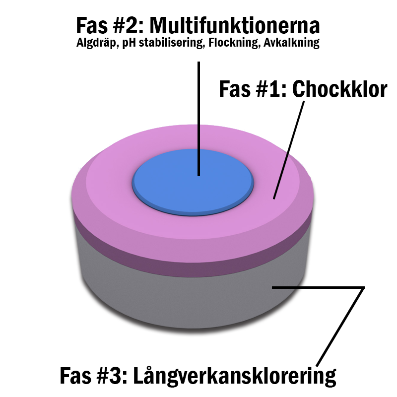 Precis som i Multiklor 2-Fas så löses chockkloret upp först och ger vattnet och sandfiltret en rejäl klorering. Sen kommer skillnaden. I andra fasen så Algdräper, Flockar, pH stabiliserar och mjukgör Multiklor Tripel Exact vattnet. Den förbereder och förenklar därmed för nästa fas, den tredje fasen som innehåller långverkansklorering på 200g som sakta löses upp.