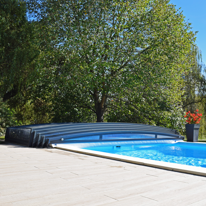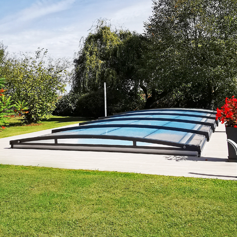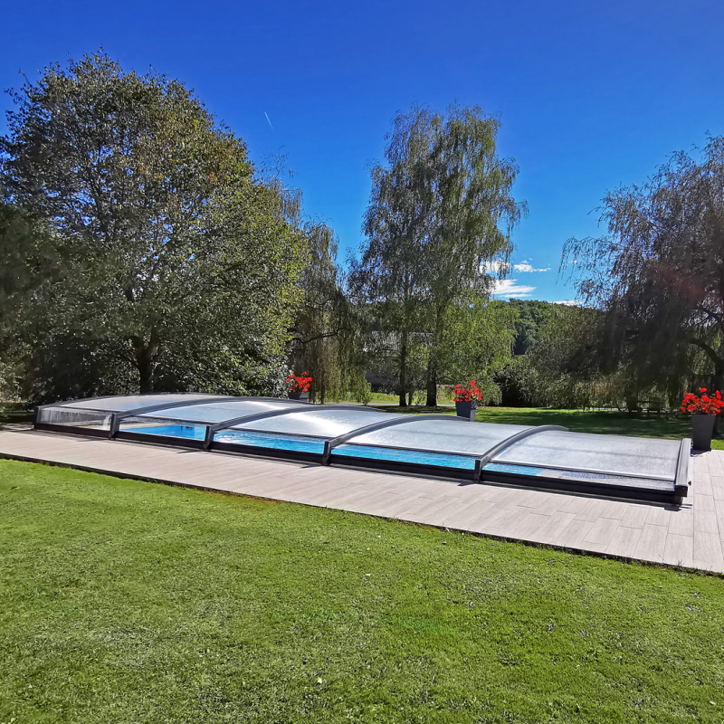 När vi för ett antal år sedan började titta på denna franska tillverkaren så föll vi omedelbart för deras supersnygga design och deras kvalitetstänk. Detaljer som att taken löper på stora kullagrade gummihjul, "enlist" design, hög kvalité på alla ingående komponenter, levererade färdigmonterade och inte i en "påse" typ - dessutom alla reservdelar upplagda på ett riktigt seriöst sätt! Då tänkte vi, detta kan vi ju jobba med! Men problemet var då att de ville ha över 200.000.- för LowProfile modellen, till en 4x8 pool! Sen var det ju det där med vattnet. . . (mer om vattnet nedan).
