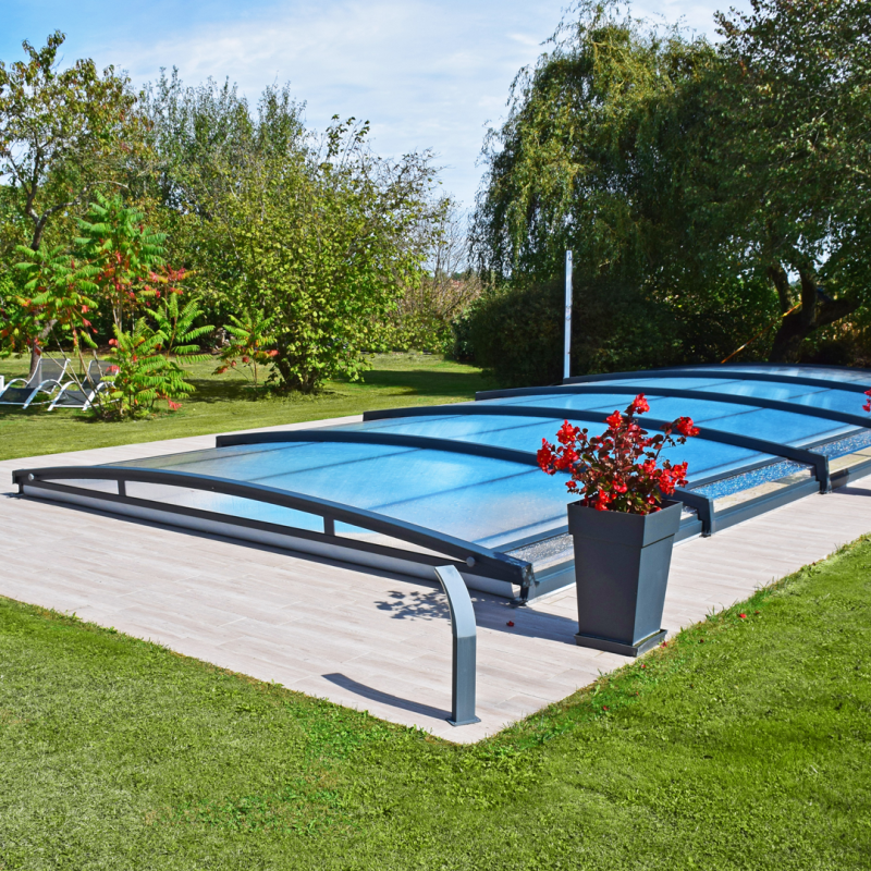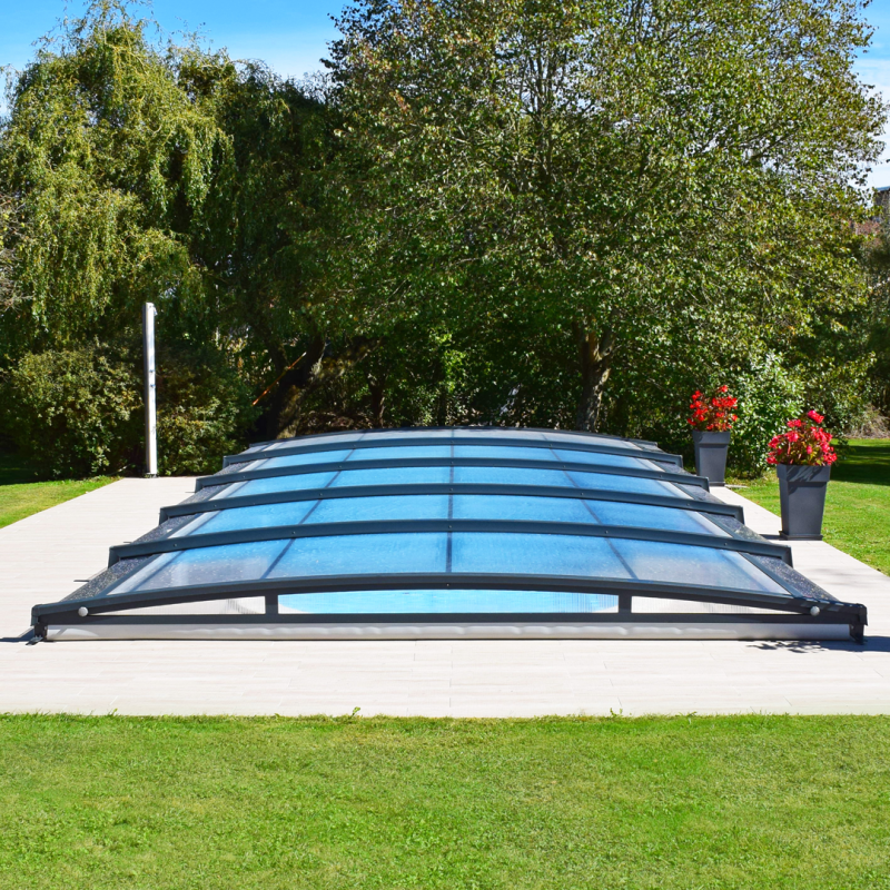 Taken har riktigt låg profil (ca 30cm höjd på första sektionen) och de löper i en snillrik list på ena sidan av poolen vilket gör installationen långt mycket enklare och snyggare. Dessutom är det inget som helst problem att montera våra tak själv, om man är lite händig, de kommer nämligen färdigmonterade på pall (se installations videon nedan). Men man får ha handräckningshjälp, såklart, annars blir det svårt att hantera så stora konstruktioner! :)