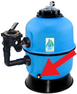 - Skruva bort filtrets bottenventil så allt vatten kan rinna ut (lägg skruven i hinken).