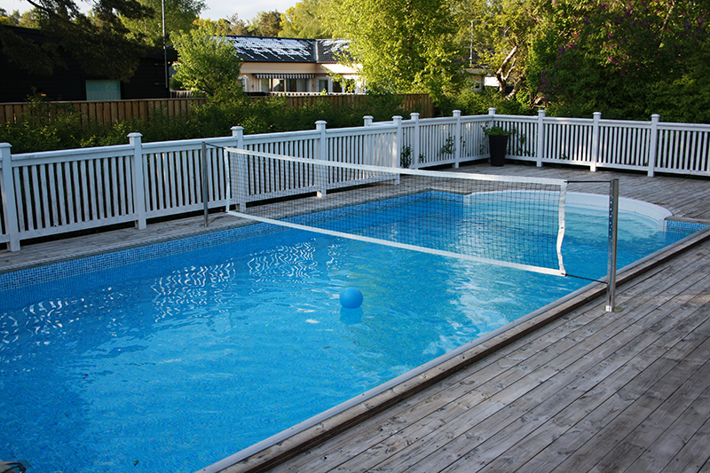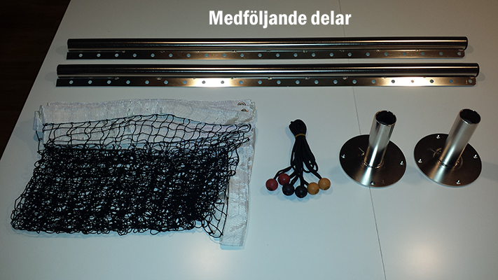 Stolpfästena är vändbara, så antingen fäller man ner dem i t.ex. ett trädäck eller en stenläggning. Man kan också skruva fast dom så fästet sticker upp. Vi har gjort nätet 4 meter långt då de flesta pooler i Sverige är 4 meter breda men även smalare pooler går bra. Konstruktionen är gjord så att man kan snurra upp nät på stolparna och sen låsa fast stolparna. Har man bredare pool så förlänger man helt enkelt de medföljande elastiska banden med snöre. Optimalt mått mellan stolparna är 4.3 meter.