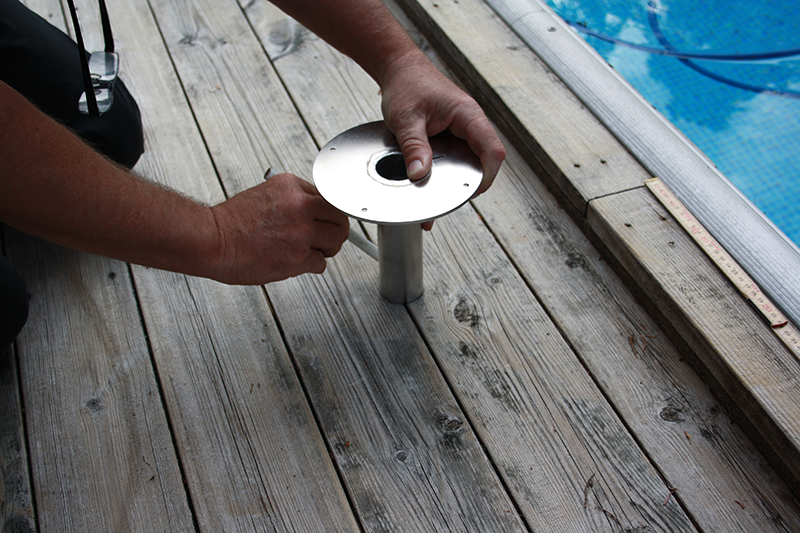 Hur man än monterar stolparna måste man se till att de sitter ordentligt fast så att alltihopa inte hamnar i poolen med fara för badande och poolkonstruktionen.