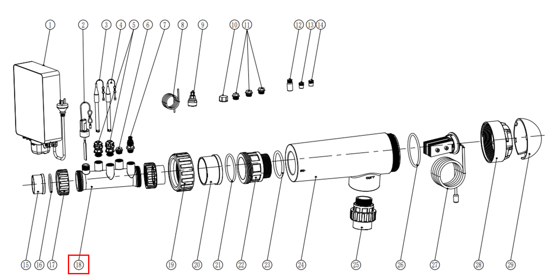 I denna monteras flödesbrytare, injektorventil till pH regleringen, ORP / Redox probe och pH samt tempgivarproben. Det ingår blindpluggar med o-ringar till alla hål, förutom till själva rörunionerna. Ska aldrig behöva bytas om man inte glömmer att tömma rörsystemet på vatten under vintern och den fryser sönder. Nummer 18 på ritningen nedan.