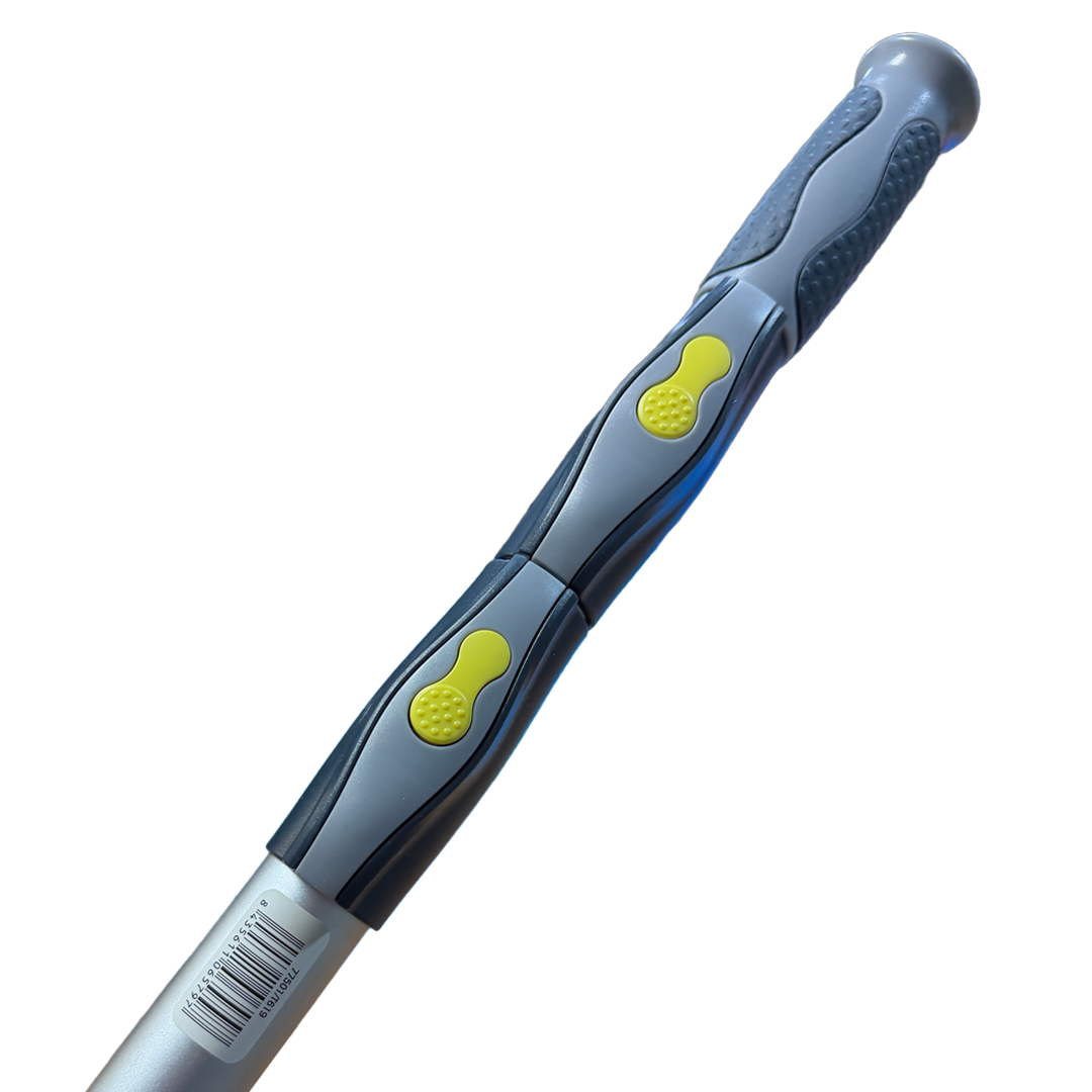 Ett smart teleskopskaft med tryckknappar man håller ner för att dra ut det till sin fulla längd av 3m