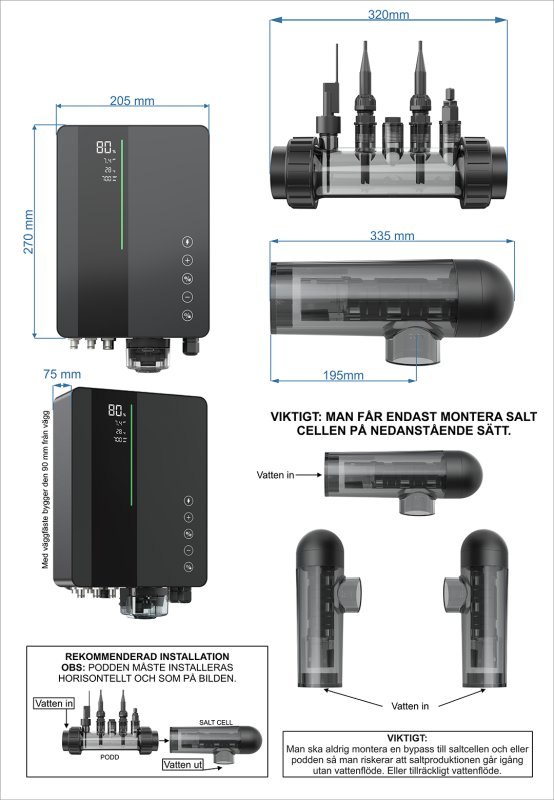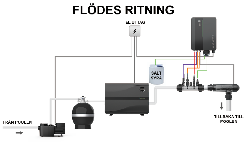 OBS: VID DRIFTSÄTTNING - TILLSE ALLTID ATT FLÖDESBRYTAREN FUNGERAR SOM DEN SKA SÅ INTE KLORINATORN FÖRSÖKER PRODUCERA UTAN FLÖDE!