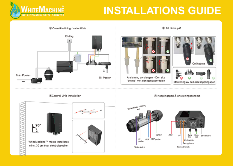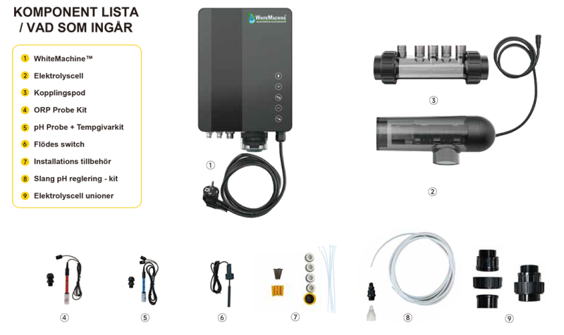 WhiteMachine™ är helt automatisk saltklorinator som styrs i samma app som BlueMachine™ och GreenMachine™. Den levereras med både pH och ORP prober (sensorer) som automatiskt justerar både pH och klornivåer till de inställda värdena. Som alla saltklorinatorer så jobbar den optimalt från en vattentemperatur på 15° och uppåt. Såklart ingår tempgivare och flödesbrytare. Som pH reglerande medel använder man pH minus Saltsyra (vanligast) eller om man har kalkrikt vatten i poolen pH minus Svavelsyra.