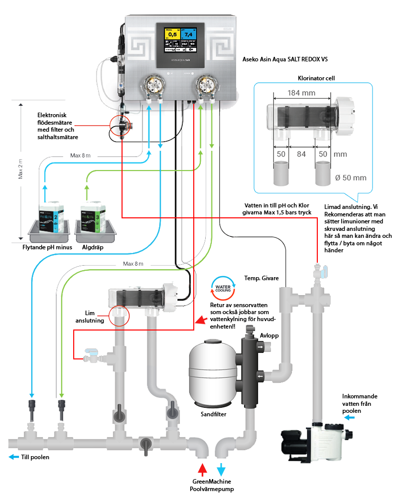 Aseko Asin Aqua SALT REDOX VS är en klordoserare med pH reglering som även ser till att du har korrekt mängd Algdräp i poolen utan att lyfta ett finger, dessutom kan du övervaka klorvärde och pH värde mm via appen i din mobil. Kloreringen sker genom en elektrolytisk process med det tillsatta saltet i vattnet och den processen skapar inte cyanusyra - så en saltklorinator är perfekt för dig som har pooltak! pH regleringen sker med flytande pH minus eftersom det salt man producerar inte blir pH stabilt och hela tiden höjer ditt pH. På så sätt hålls pH värdet på rätt nivå hela tiden och du kan bada i lugn och ro.