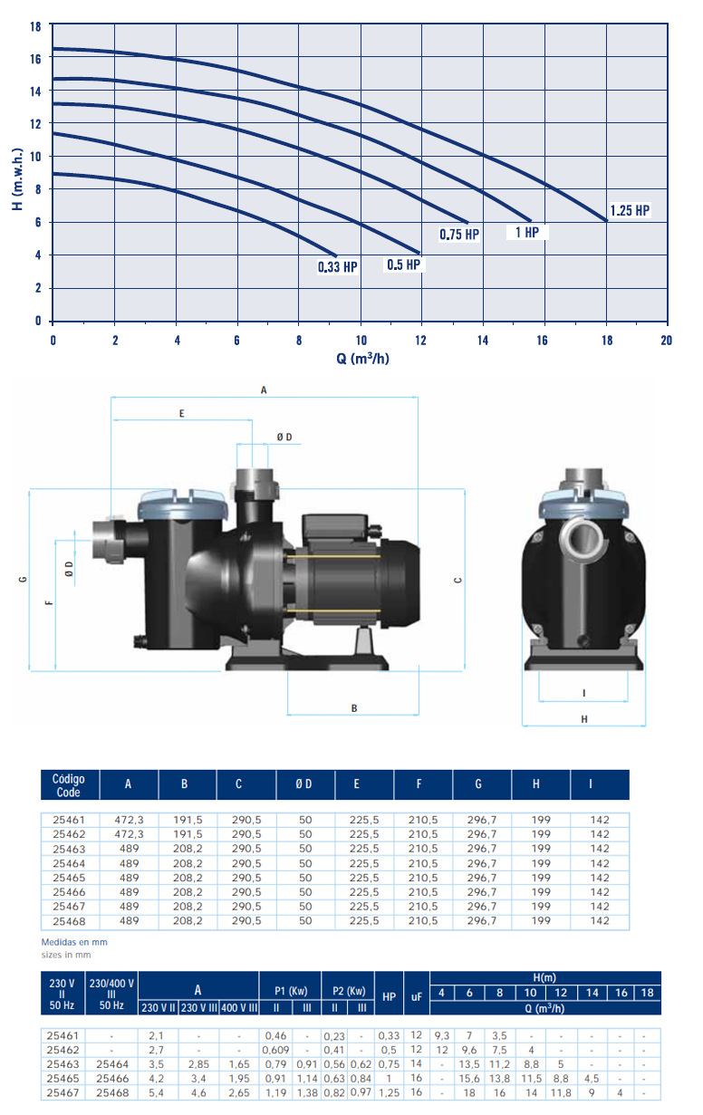Motorer från 1/3 HP till 1,25 HP i enfas och från 3/4 HP till 1,25 HP i trefasmotorer. GS-märkning. IP-55 Motorskydd, klass F isolering. Alla delar i kontakt med vatten gjord av SS AISI-316. Ø 50 mm union anslutning. Flödeshastigheter ges vid 6 mVP för 1/3 HP, 8 mVP 1/2 HP och 10 mVP för resterande pumpar. 3000 varv per minut Är certifierad enligt EN-60335-2-41:1996. Täthetsklass IP55. GS- och TÜV-godkänd.