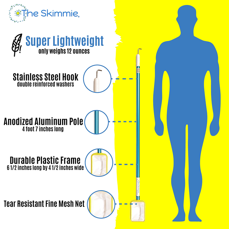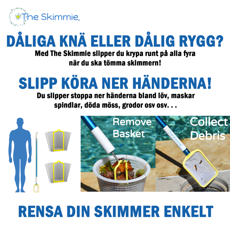 Som vanligt så jobbar vi direkt med tillverkarna så inga mellanhänder här inte! The Skimmie och The Happy tab tillverkas av ett litet familjeföretag i South Carolina och det är ett kreativt par som vi hittat, det kan jag lova. The Skimmie är en riktigt smart produkt och den levereras med 2 st skimmer handtag, skaftet med skimmer kroken och håven för att rensa bort det som blir kvar när man lyft ut skimmerkorgen. Det blir ju alltid lite löv och skräp kvar som man ju inte vill ha in i sitt sandfilter eller i pumpens förfilter. Använder ni NetSkim så kommer det att komma en variant på The Skimmie som är magnetisk istället så man kan ha NetSkim i när man lyfter ur korgen. Men vi har valt att ta hem endast två av deras produkter ännu så länge.