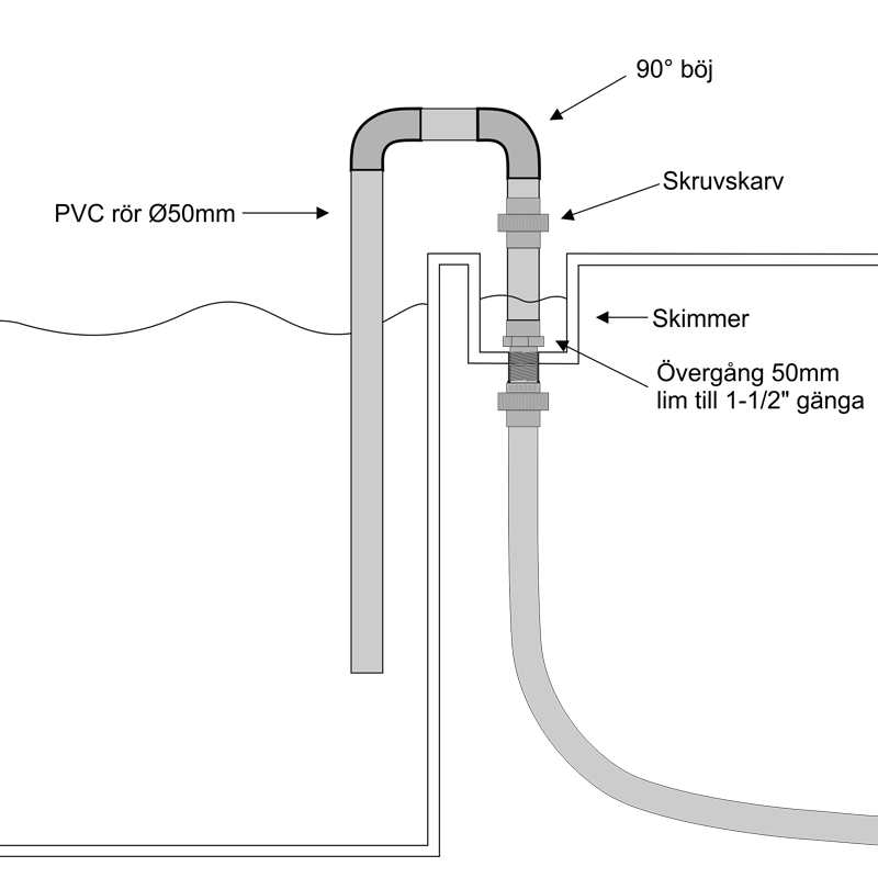 Förutsättningen för att denna konstruktion ska fungera är att utloppet i skimmern / bräddavloppet har en 1-1/2" gänga eller 2" gänga i botten på din skimmer. Men det har de allra flesta skimmers till "riktiga pooler". Börja med att kontrollera detta. Går det inte får man göra en adapter till den sugplatta som medföljer skimmern för bottensug. Har man ett teleskopskaft med slang och bottensug kan man ju använda den utrustningen istället för att bygga en snorkel. Men det brukar bli problem med sugplattan så fort vattnet runt den försvinner.