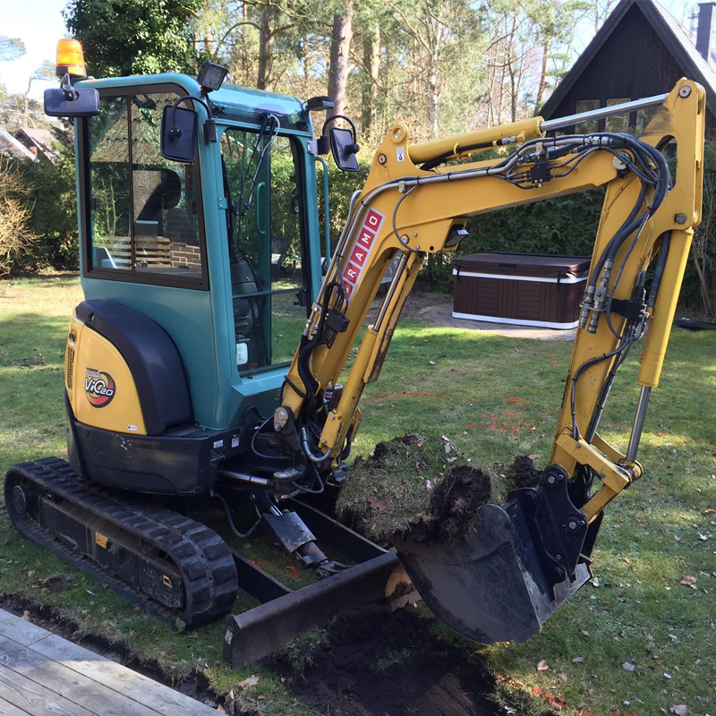 Första "spadtaget" med den hyrda grävmaskinen från Cramo. Denna gräver med enkelhet en pool som är 1.5 meter djup.