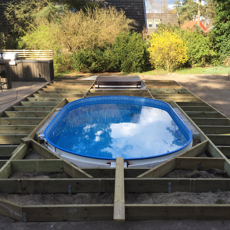 Ett rejält trädäck är under konstruktion. Eftersom poolen är oval så blir bygget lite speciellt i ovalerna så att säga.