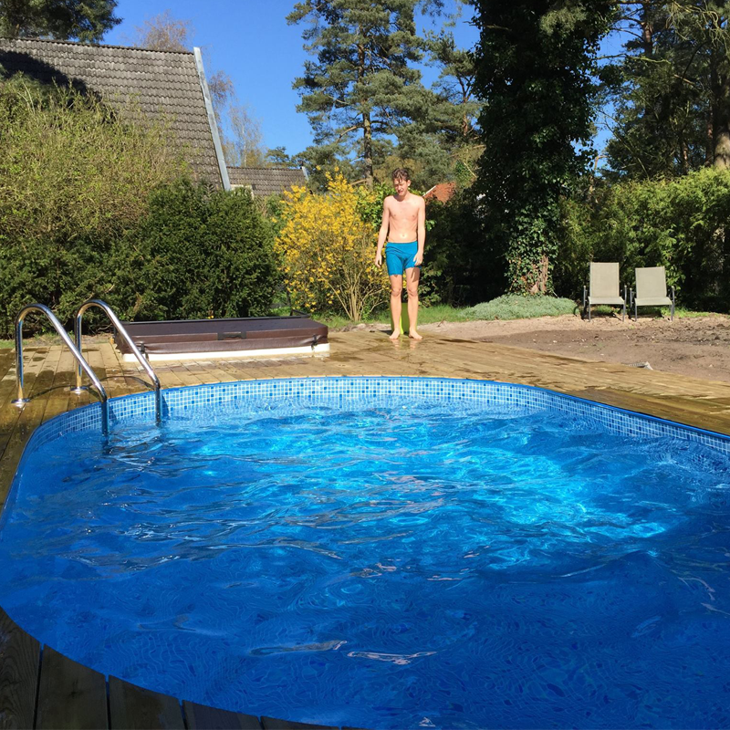 Premiär dopp!! När poolen nått 28 grader. Till denna Tropical pool valde kunden att betala lite extra för mosaik liner.