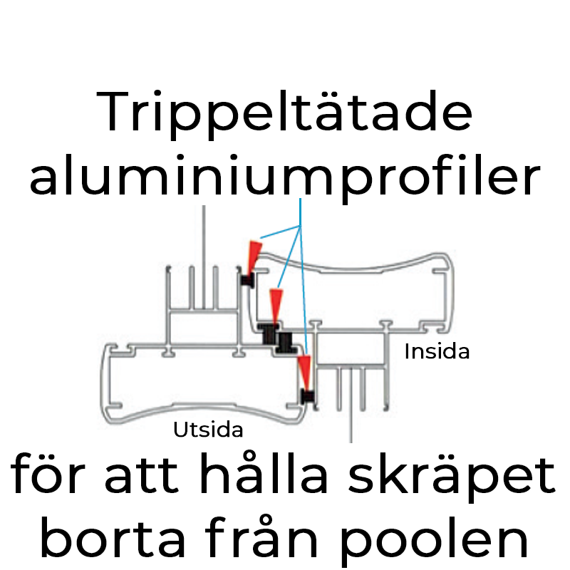 Utav den anledningen så vill många inte ha "kanalplasten" i takdelen längre, trots att den erbjuder en nästan lika klar vy av vattnet i poolen och dessutom ger en mycket högre isoleringsgrad. Utav den anledningen så erbjuder vi en uppgradering till klar "glas" i våra tak. Det är inte nödvändigt enligt vår mening, men såklart är det en utseende fråga också. Vid vårt besök på fabriken i Frankrike så tittade vi på tak som var standard utrustade med klar "kanalplast", som hade varit i bruk under 8 år utan någon som helst algpåväxt eller skräp inne i kanalerna. Fortfarande helt klara - dock blir det alltid kondens på undersidan av taken men det är helt naturligt då det finns en temperaturskillnad.