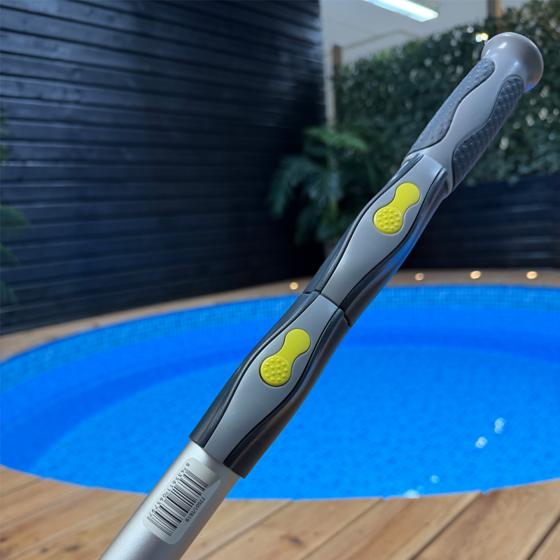 Ett smart teleskopskaft med tryckknappar man håller ner för att dra ut det till sin fulla längd av 3m
